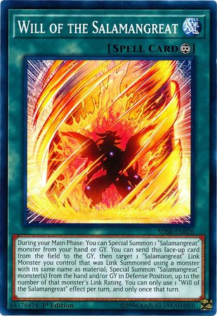 During your Main Phase: You can Special Summon 1 "Salamangreat" monster from your hand or GY. You can send this face-up card from the field to the GY, then target 1 "Salamangreat" Link Monster you control that was Link Summoned using a monster with its same name as material; Special Summon "Salamangreat" monster(s) from the hand and/or GY in Defense Position, up to the number of that monster's Link Rating. You can only use 1 "Will of the Salamangreat" effect per turn, and only once that turn.
