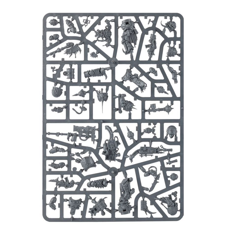 These models feature a wide range of weapons and heads, many of which are designed to fit a specific model – there are 8 boltguns, 4 plague knives, 2 bubotic axes, a blight launcher, a plasma gun, a meltagun, a plaguebelcher, a heavy plaguespewer (with backpack), a mace of contagion, a great plague cleaver, a plague flail, a plasma pistol and a bolt pistol. There are 2 weapon options available for the unit Champion: a specific plaguesword and power fist, and there are a total of 16 bare and helmeted heads. 2 specific arms are included for a model holding a blight grenade, with one hand pulling the pin.