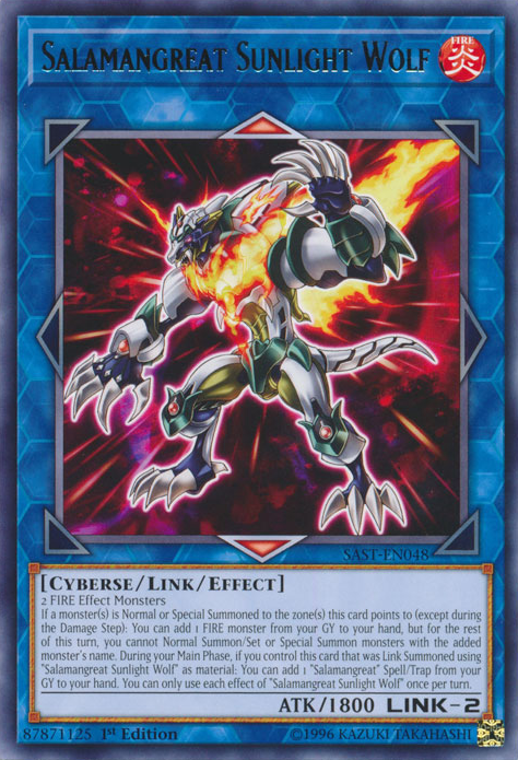 If a monster(s) is Normal or Special Summoned to the zone(s) this card points to (except during the Damage Step): You can add 1 FIRE monster from your GY to your hand, but for the rest of this turn, you cannot Normal Summon/Set or Special Summon monsters with the added monster's name. During your Main Phase, if you control this card that was Link Summoned using "Salamangreat Sunlight Wolf" as material: You can add 1 "Salamangreat" Spell/Trap from your GY to your hand. You can only use each effect of "Salamangreat Sunlight Wolf" once per turn.